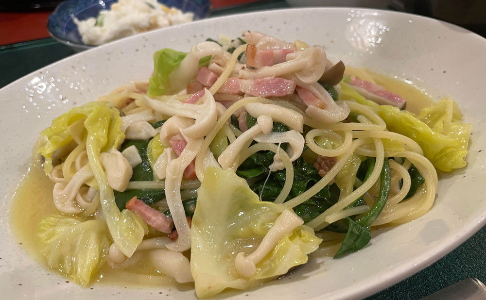 写真をご覧いただければわかると思いますが、パスタ以外に、「パン」「スープ」「サラダ」「小鉢2皿」がついており、観光地でこの量で1,200円は相変わらず安い!と思いました。