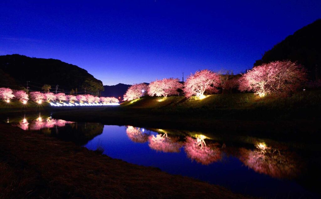 2月初旬から3月初旬にかけて、道中の青野川で「南の桜と菜の花畑」のイベントを行っています。
